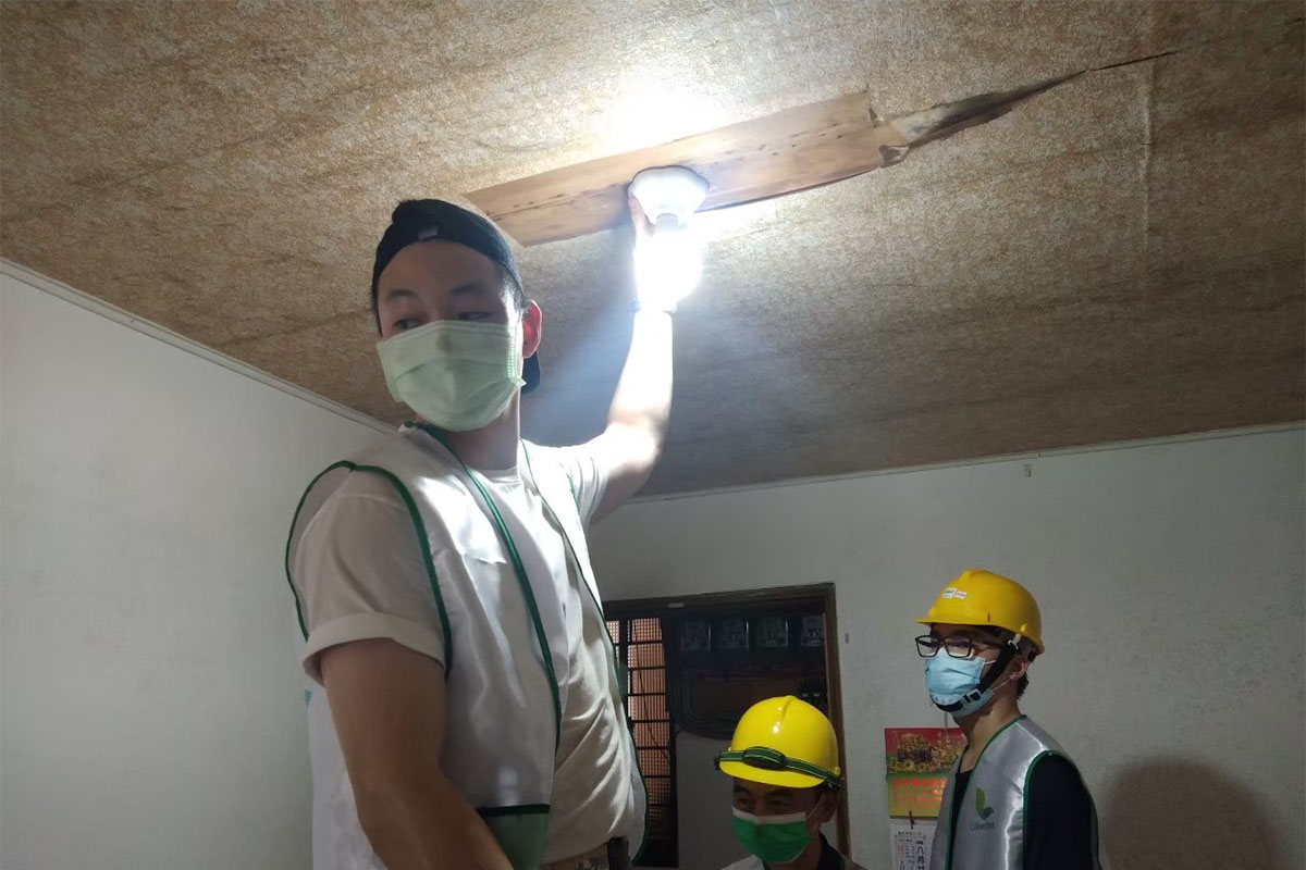 第一趟任務,阿生和阿傑負責更換二位伯伯房間天花板的燈座,施作前必須先切斷電源,二個孩子忍受室內36度的高溫,爬上A型梯,在暗黑之中藉由手電筒照明,依照師父的指示作業。豆大的汗珠不停地從額上、身上飆了出來,然而他們依然聚精會神地施作,任由汗水沿著臉頰、順著手肘往下流,一滴滴竟滴到了在下方扶梯的師父臉上。好不容易作業完成,打開電源,房間瞬地恢復明亮,這才發現二個孩子已然渾身溼透;下了工作梯,衣袖已不及擦汗,伯伯趕忙遞上毛巾和冰茶表達感謝。任務完成,二人分享心得:「今天下午流的汗水,真是比運動時還暢快,原來幫助人是這麼開心的事啊!」臉上竟是滿足的笑容。